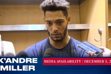 Le défenseur des Rangers de New York K’Andre Miller répond aux questions des médias après le match du 5 décembre…