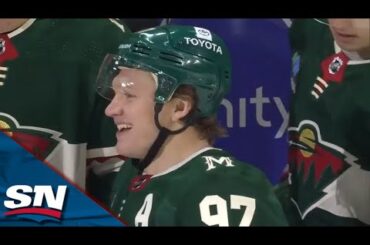 Regardez l’attaquant du Wild du Minnesota, Kirill Kaprizov, tirer depuis le milieu de la glace alors que le compte à…