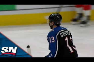 Regardez le joueur des Blue Jackets de Columbus, Kent Johnson, tenter de faire « The Michigan ». #shorts #columbusbluejackets #nhl #hockey