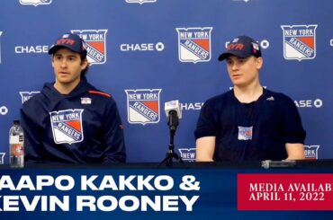 Les attaquants des Rangers de New York Kaapo Kakko et Kevin Rooney répondent aux questions des médias après l’entraînement du…
