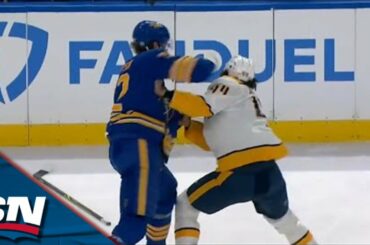 Regardez Tage Thompson des Sabres de Buffalo lâcher les gants avec Kiefer Sherwood des Predators de Nashville dans ce qui…