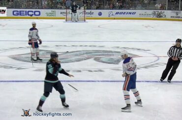 Klim Kostin contre John Hayden des Oilers d’Edmonton au match Seattle Kraken le 18 mars 2023. via https://www.hockeyfights.com