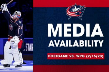 Erik Gudbranson, Patrik Laine, Joonas Korpisalo, Kent Johnson et l’entraîneur-chef Brad Larsen s’adressent aux médias après la victoire 3-1 de…
