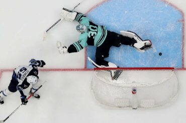 L’attaquant de Kraken, Jordan Eberle, effectue un revers et descend la barre pour égaliser le match 1-1 contre les Jets…