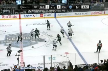 Jeff Malott contre Liam O’Brien des Kings de Los Angeles lors du match de l’Utah Hockey Club le 23 septembre…