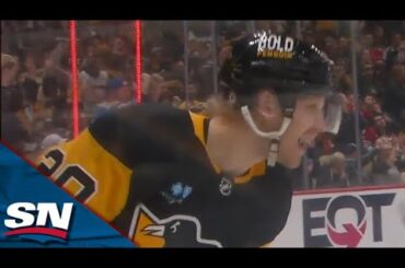 Regardez l’attaquant des Penguins de Pittsburgh Lars Eller célébrer son 1000e match dans la LNH en réussissant un rebond devant…