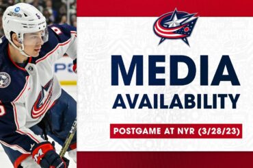 Sean Kuraly, Carson Meyer, Trey Fix-Wolansky et l’entraîneur-chef Brad Larsen s’adressent aux médias après le match des Blue Jackets de…