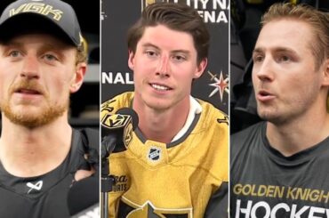 Tanner Laczynski, Ben Hutton et l’entraîneur-chef Bruce Cassidy parlent aux médias après un patin matinal au City National Arena. N’oubliez…