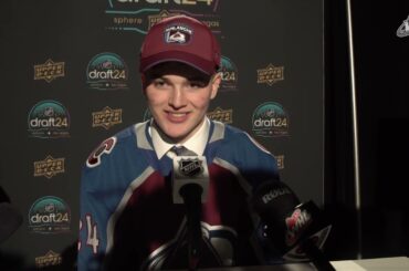 L’attaquant des Américains de Tri-City Max Curran s’adresse aux médias après avoir été sélectionné 161e au total par l’Avalanche du…