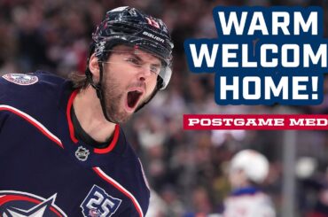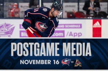 L’entraîneur-chef Pascal Vincent, Damon Severson, Dmitri Voronkov et Adam Fantilli parlent aux médias après le match de ce soir contre…
