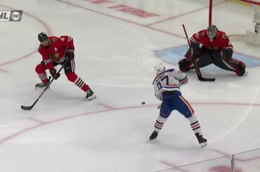 L’attaquant des Oilers Connor McDavid frappe Jack Johnson et marque, donnant une avance de 3-1 à Edmonton sur les Blackhawks