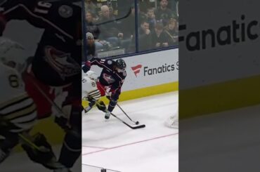 Avec déjà un but à son actif, l’attaquant des Blue Jackets Kent Johnson tente de marquer un autre but en…