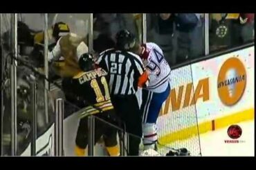 Travis Moen (Canadiens de Montréal) contre Andrew Ference (Bruins de Boston) le 2/9/11. Cambell Boychuck