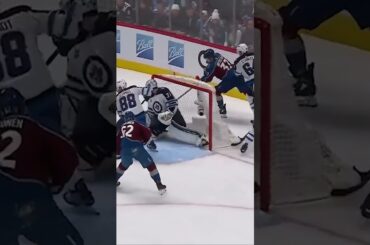 Casey Mittelstadt pousse un défenseur derrière le filet pour faire passer une rondelle à un autre défenseur et obtenir une…