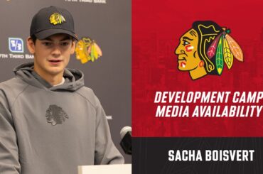 L’espoir des Blackhawks Sacha Boisvert s’adresse aux médias à Chicago lors de la première journée du camp de développement. Abonnez-vous…