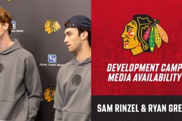 Les espoirs des Blackhawks Sam Rinzel et Ryan Greene s’adressent aux médias au camp de développement après le repêchage de…