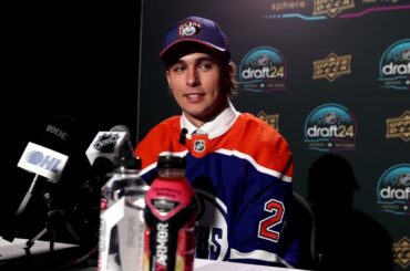 Sam parle aux médias après avoir été sélectionné 32e au total par les Oilers d’Edmonton lors du repêchage 2024 de…