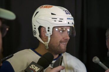 Viktor parle aux médias après une séance de patinage informelle au Downtown Community Arena d’Edmonton mardi.