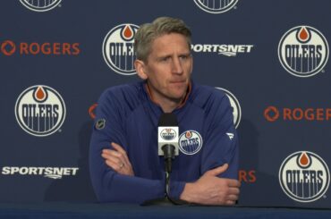 Kris s’adresse aux médias au sujet du match de son équipe après l’entraînement des Oilers lundi à Rogers Place.