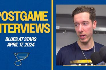 Écoutez Jordan Binnington, Robert Thomas et Drew Bannister après une défaite 1-2 en fusillade à Dallas le 17 avril 2024.