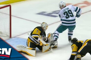Regardez l’attaquant des Sharks de San Jose Logan Couture donner un coup de coude à la jambière du gardien de…