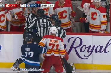 Martin Pospisil contre Logan Stanley des Flames de Calgary lors du match des Jets de Winnipeg le 27 septembre 2023.…