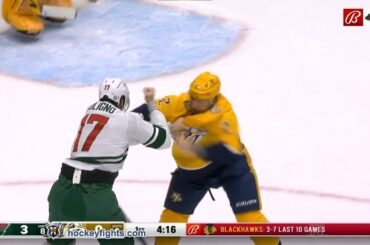 Marcus Foligno contre Luke Schenn du Wild du Minnesota au match des Predators de Nashville le 30 novembre 2023. via…