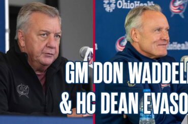 L’entraîneur-chef des Blue Jackets de Columbus, Dean Evason, et le directeur général Don Waddell s’adressent aux médias avant le premier…