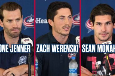Boone Jenner, Zach Werenski et Sean Monahan s’adressent aux médias avant le premier jour du camp d’entraînement des Blue Jackets…