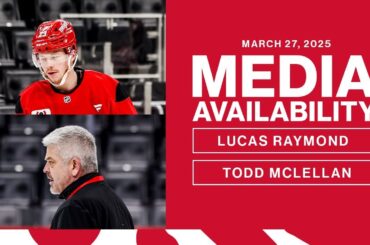 Lucas Raymond et Todd McLellan parlent avec les médias après le patin matinal de Détroit le jeudi 27 mars 2025…