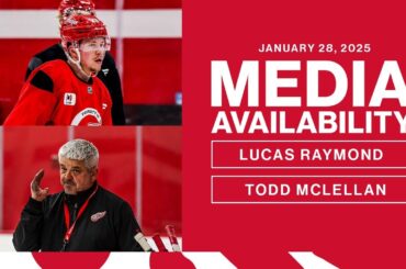 Lucas Raymond et Todd McLellan parlent avec les médias suivant la pratique de Détroit au Belfor Training Center le 28…