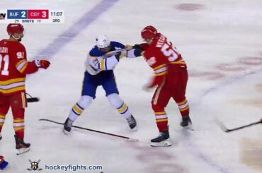 Peyton Krebs vs Mackenzie Weegar des Buffalo Sabres au Calgary Flames le 23 janvier 2025. Via https://www.hockeyfights.com