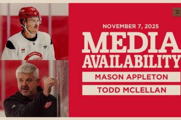 Mason Appleton et Todd McLellan parlent avec les médias après l’entraînement matinal des Red Wings au Little Caesars Arena le…