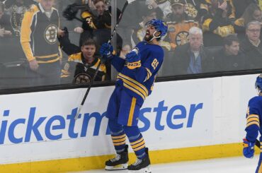 Après avoir marqué le but égalisateur à la fin de la troisième période, Dylan Cozens vole la rondelle à Patrice…