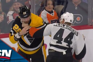 Regardez comment Marcus Pettersson des Penguins de Pittsburgh lâche les gants avec Nicolas Deslauriers des Flyers de Philadelphie après avoir…