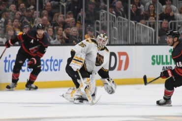 Linus Ullmark sort du filet à 64 pieds pour jouer la rondelle et réussit à dégager la zone.