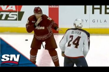 Regardez l’attaquant des Coyotes de l’Arizona Nick Ritchie et Mathieu Olivier des Blue Jackets de Columbus lâcher les gants en…