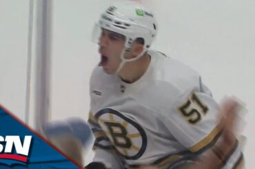 La recrue Matthew Poitras a marqué ses deux premiers buts dans la LNH en troisième période pour propulser les Bruins…