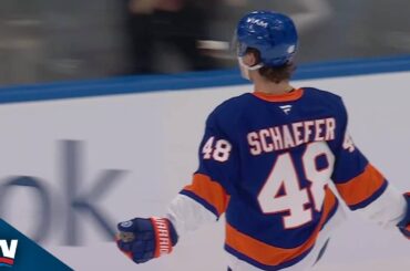 Le défenseur recrue des Islanders de New York Matthew Schaefer remporte son premier point dans la LNH sur un plat…