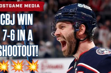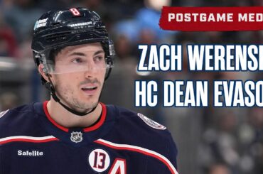 Zach Werenski, Adam Fantilli et l’entraîneur-chef Dean Evason parlent aux médias après la victoire de 7-3 de ce soir sur…