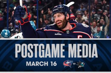 L’entraîneur-chef Dean Evason, Charlie Coyle, Ivan Provorov et Denton Mateychuk s’adressent aux médias après le match. Suivez le #CBJ sur…