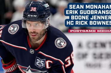 Sean Monahan, Erik Gudbranson, Boone Jenner et l’entraîneur-chef Rick Bowness s’adressent aux médias après le match. Suivez le #CBJ sur…