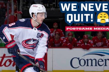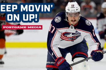 Zach Werenski, Mason Marchment, Adam Fantilli et l’entraîneur-chef Rick Bowness s’adressent aux médias après le match. Suivez le #CBJ sur…