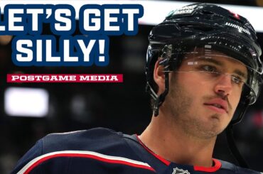 Zach Werenski, James van Riemsdyk, Adam Fantilli et l’entraîneur-chef Dean Evason s’adressent aux médias après le match. Suivez le #CBJ…