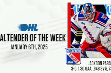 Jackson Parsons des Rangers de Kitchener est le gardien de but de la semaine de la Ligue de l’Ontario pour…