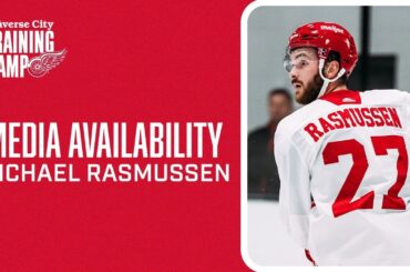 L’attaquant des Red Wings Michael Rasmussen s’entretient avec les médias après le troisième jour du camp d’entraînement de Détroit au…