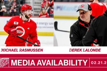 Michael Rasmussen et Derek Lalonde parlent avec les médias après l’entraînement de Détroit au PNC Arena le mercredi 27 mars…