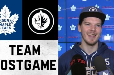 Les joueurs et l’entraîneur s’entretiennent avec les médias après la victoire 4-1 des Leafs sur les Jets de Winnipeg jeudi.…
