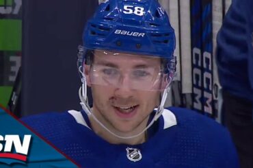 Regardez comme l’attaquant des Maple Leafs de Toronto Michael Bunting est poussé hors de la glace par le juge de…