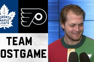 Les joueurs et l’entraîneur discutent avec les médias après la victoire 3-4 des Leafs sur les Flyers de Philadelphie jeudi.…